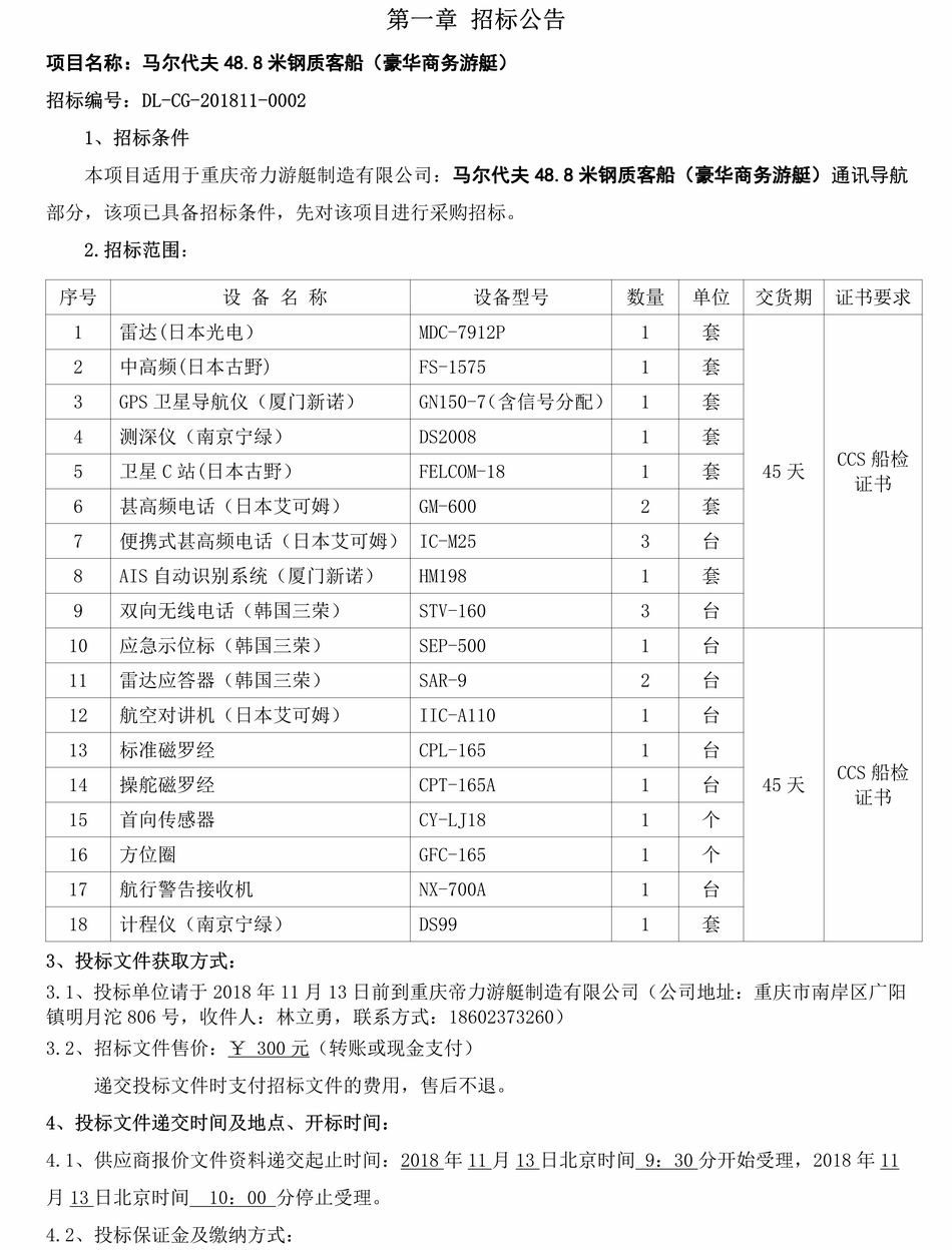 馬爾代夫48.8米鋼質客船(豪華商務游艇)通訊導航部分招標公告