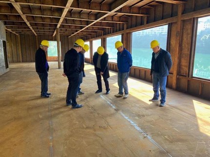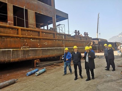 11月11日,集團(tuán)公司楊勇董事長陪同彭水縣羅遠(yuǎn)江副縣長視察彭水九黎船舶建造項(xiàng)目現(xiàn)場(chǎng)。該項(xiàng)目是集團(tuán)公司旗下子公司重慶帝力游艇制造有限公司承接的彭水九黎旅游運(yùn)輸服務(wù)有限公司的2艘異地船舶建造項(xiàng)目。游船總長44.5米,型寬10.6米,型深3.1米,吃水1.8米;躉船總長48米,型寬13.8米,型深2.8米,吃水1.8米。
