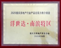 ? 2020年10月,洋世達(dá)·南濱特區(qū)項(xiàng)目被重慶市房地產(chǎn)開發(fā)協(xié)會(huì)評(píng)為“2020重慶房地產(chǎn)行業(yè)產(chǎn)品兌現(xiàn)力推介樓盤”